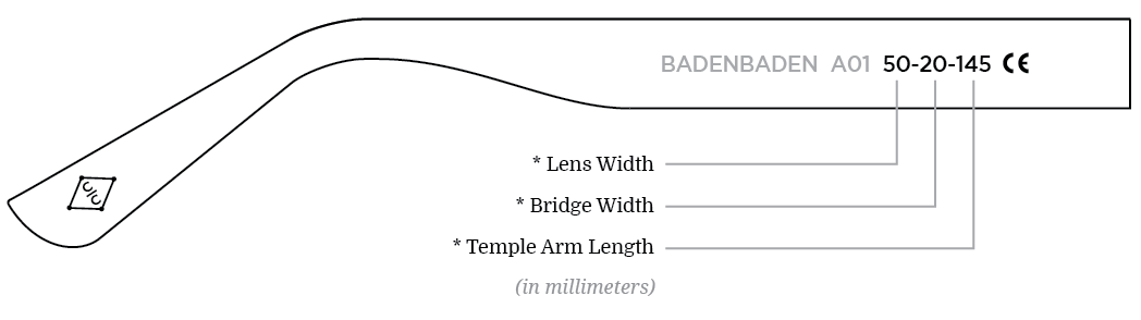 On each product page, the frame measurements are listed as three numbers. (Ex. 50-20-145). The first number represents the width of one lens in millimeters. The second number represents the width of the bridge, and the third number represents the length of the temple arm.